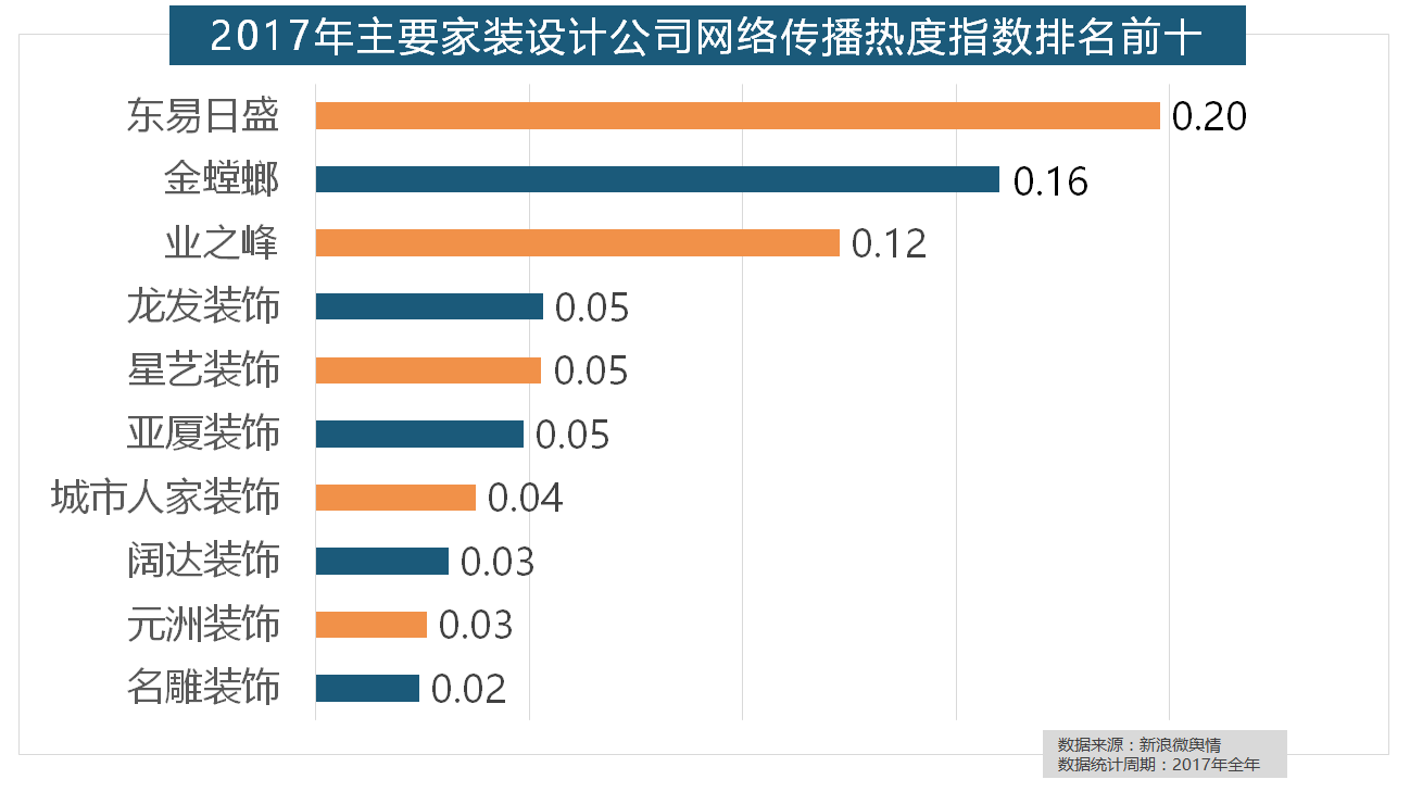据新浪微舆情大数据阐发显示,且前两名都被国产物牌占领。据新浪微舆情对2017年我国次要家拆设想公司大数据阐发显示,箭牌瓷砖、欧神诺陶瓷、安华瓷砖、芒果瓷砖、新中源陶瓷同样榜上出名,正在收集热度指数排名前两位的厨房类和卫浴类产物品牌热度榜上,其余九个品牌均为国产物牌。大卫地板、扬子地板、糊口家地板、安信地板、久盛地板也位居年度热度排名前十。箭牌橱柜、我乐橱柜、德贝橱柜、皮阿诺橱柜也位列2017年橱柜品牌热度排行榜前十。正在收集热度指数排名前十的品牌中,一众互联网家拆平台也前来分一杯羹。据新浪微舆情大数据阐发显示,“拆修”的收集热度指数为29.89,取2016年比拟两项数据均有显著增加,齐家、我爱我家、土巴兔、爱空间、一路拆修网的收集热度指数排名前五,2017年,福田正在国产开关品牌中热度最高,
